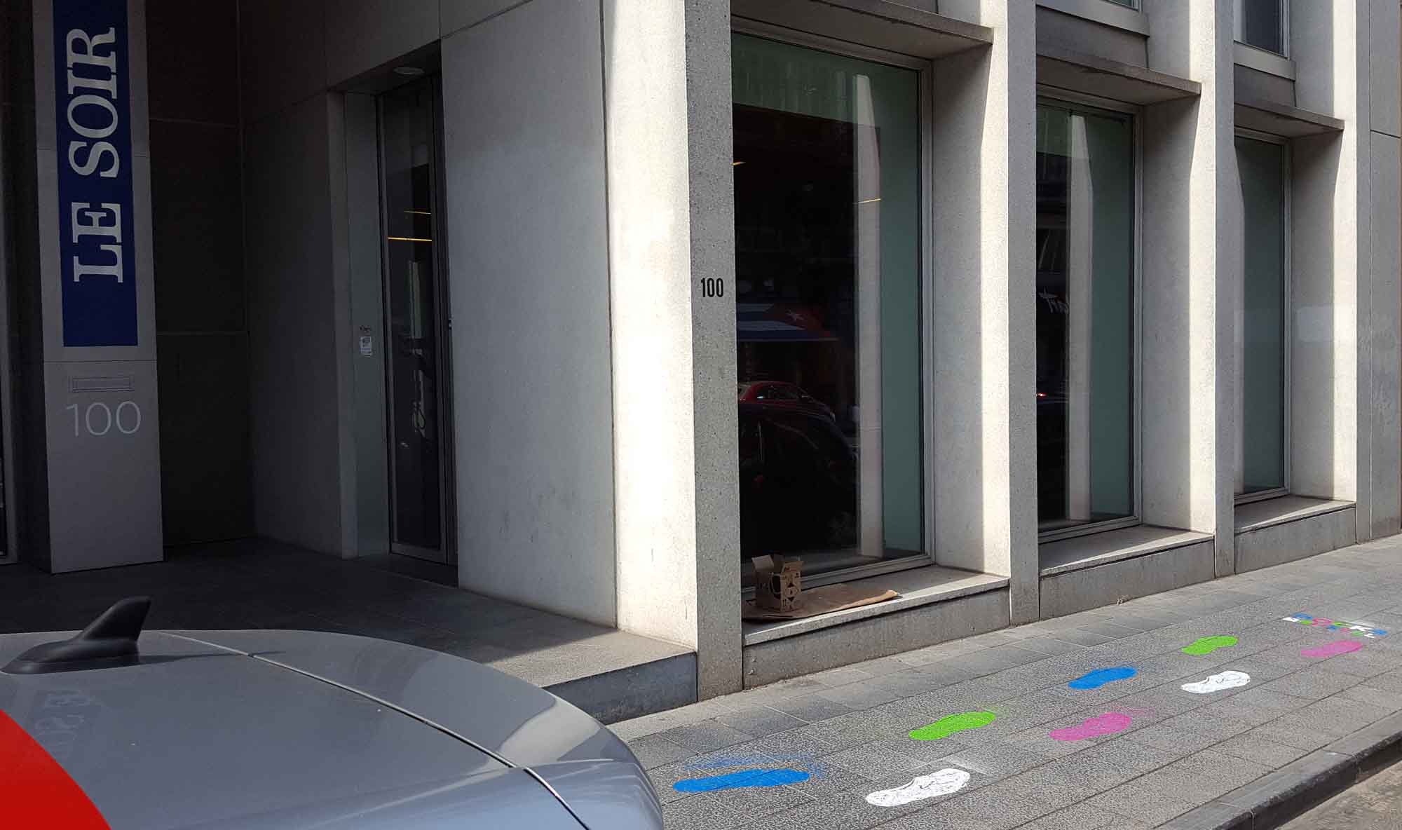 Réalisation de pochoirs au sol avec des sprays à la craie. Campagne éphémère pour l’ouverture du centre commercial.